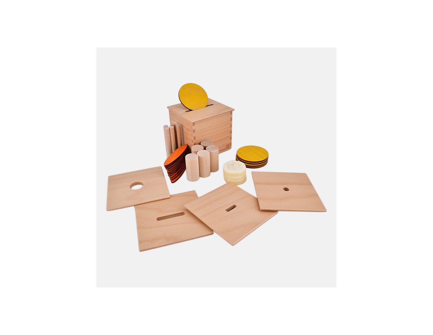 A small wooden box designed with an opening that is easy for children to use, allows them to practice and repeat the sequence “open-empty-close-fill”. 5 different interchangeable lids are included with their respective sets of elements to be inserted (buttons, disks, ellipses, cylinders, sticks).