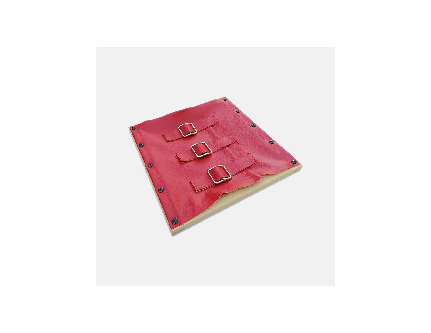 A 30 x 30 cm beech wood frame, to which 2 strips of coloured eco-leather are attached, joined by 3 belts with buckles.