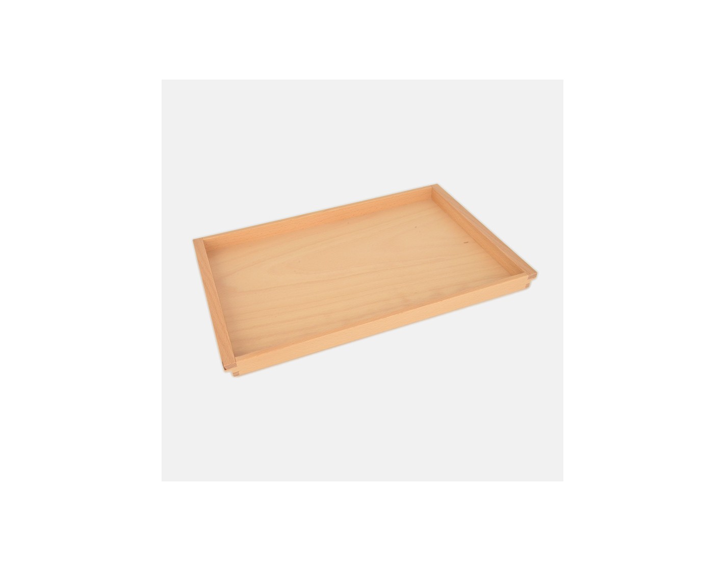 Work and transport tray, with low side, made of wood and painted in every part with non-toxic products; equipped with lateral grooves for an easier and safer grip. External dimensions: 22 x 16 h 2.5 cm.
