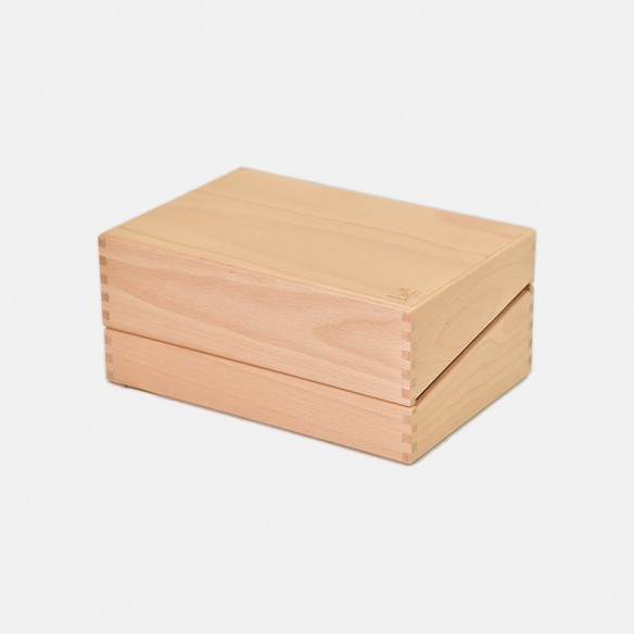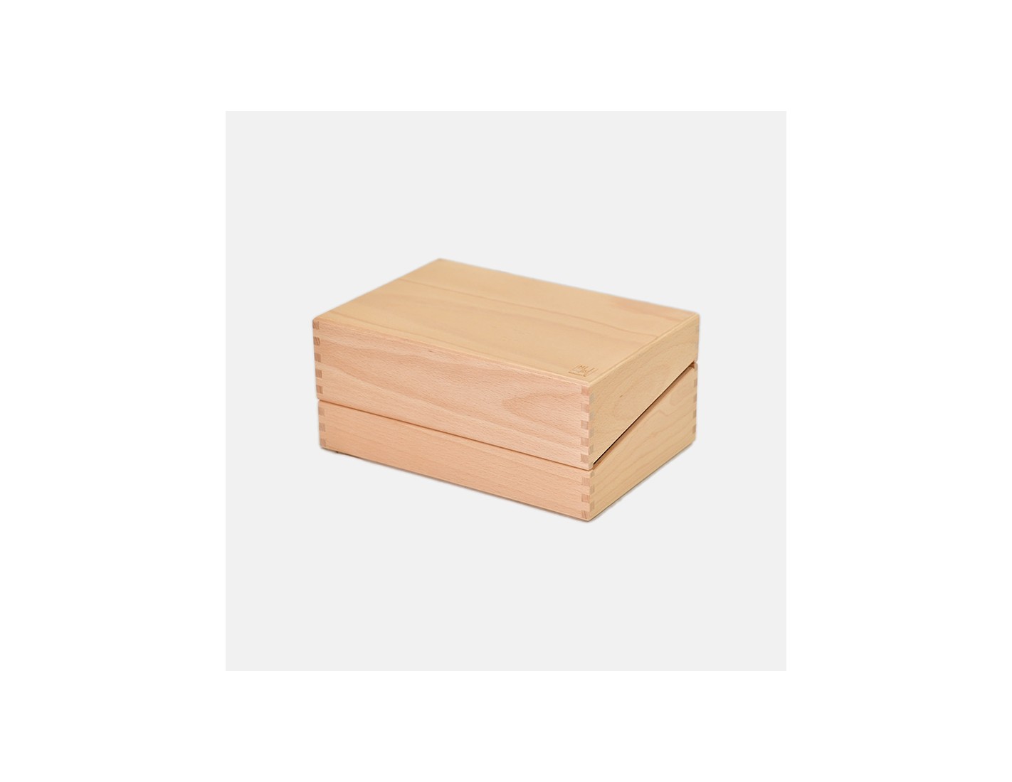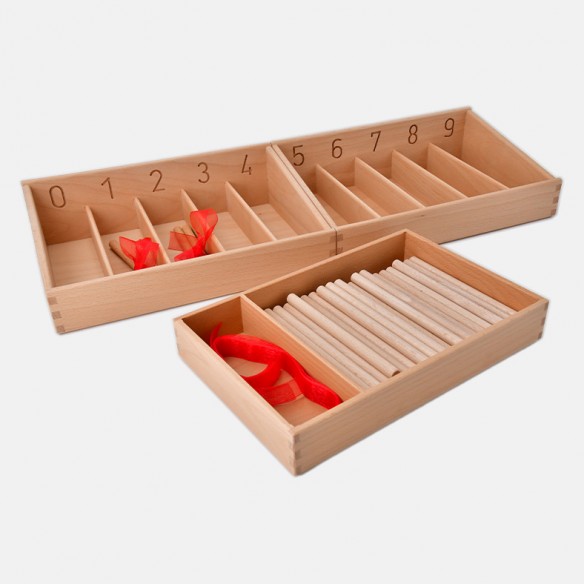 Wooden box with 45 spindles and ribbons. This material allows you to associate the quantities of spindles with the symbols of the numbers from 0 to 9 carved on the top of the compartments. The box is divided into two parts.