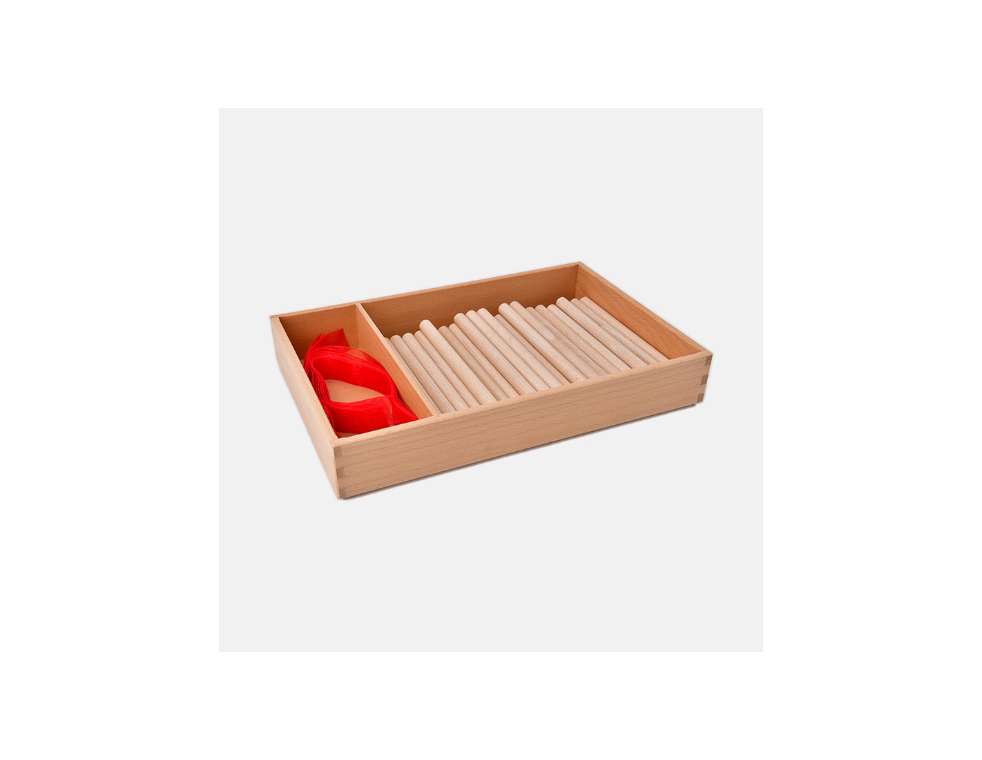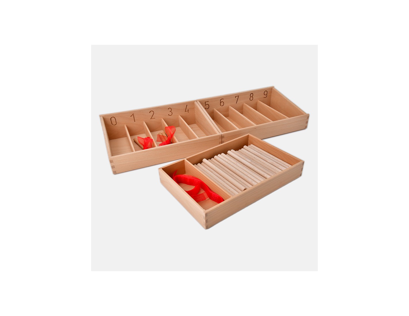 Wooden box with 45 spindles and 8 ribbons. This material allows you to associate the quantities of spindles with the symbols of the numbers from 0 to 9 carved on the top of the compartments. The box is divided into two parts.