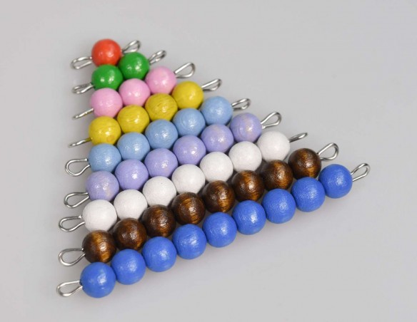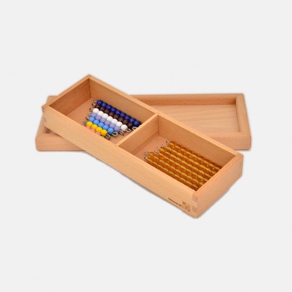 Wooden box with lid containing 9 stainless steel 10 sticks, with glass beads and 1 stainless steel 1-9 stick scale, with colored wooden beads, for the Seguin tables 11-19.