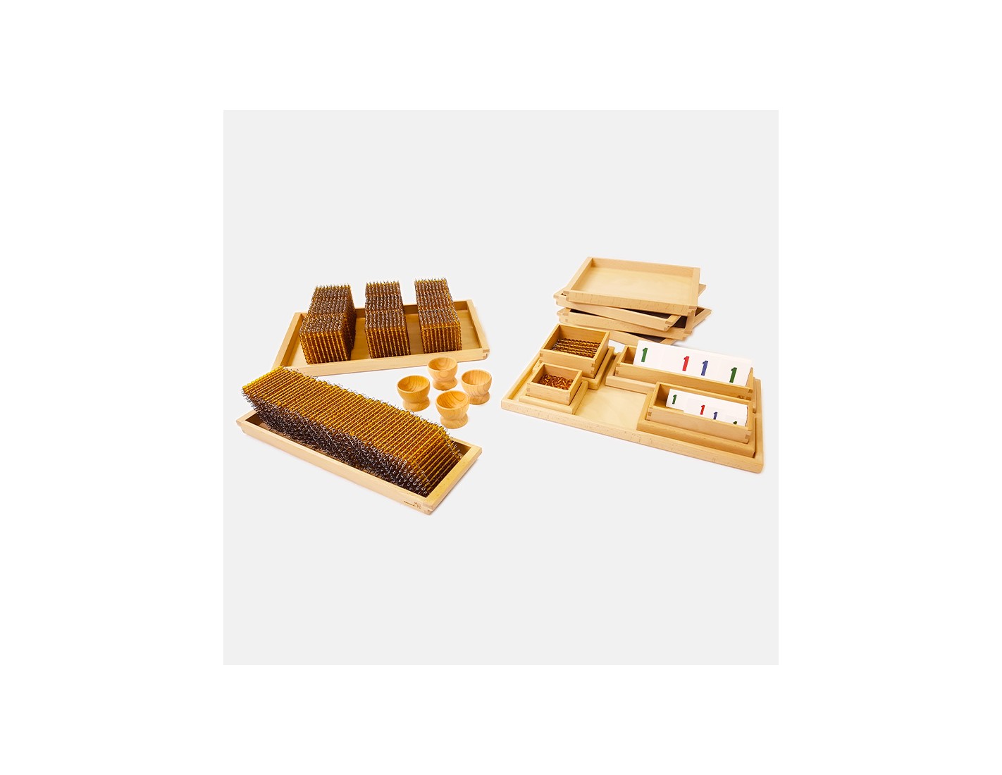 The work with golden beads is proposed to the child starting from the age of four, after he has practiced with the first materials of psychoarithmetic and can count up to 10 knowing with certainty the names and quantities associated with the numbers from 1 to 9; the main purpose is to familiarize the child with the decimal system. The material of the...