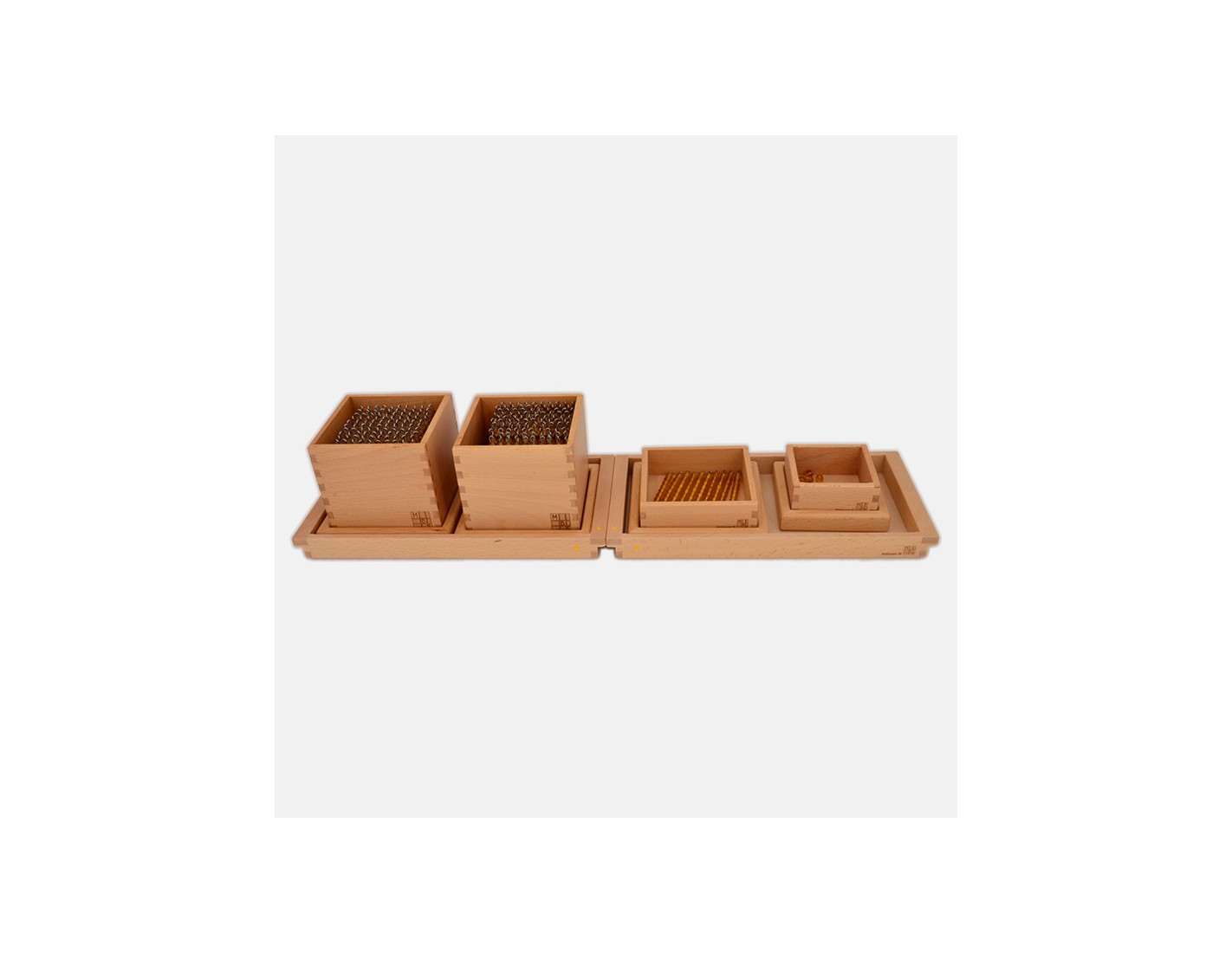 Material of the gold-colored glass beads and stainless steel sticks: 10 beads, 10 sticks, 10 squares, 1 cube, all in their respective wooden boxes with lids. Two wooden trays are included for easy transport.