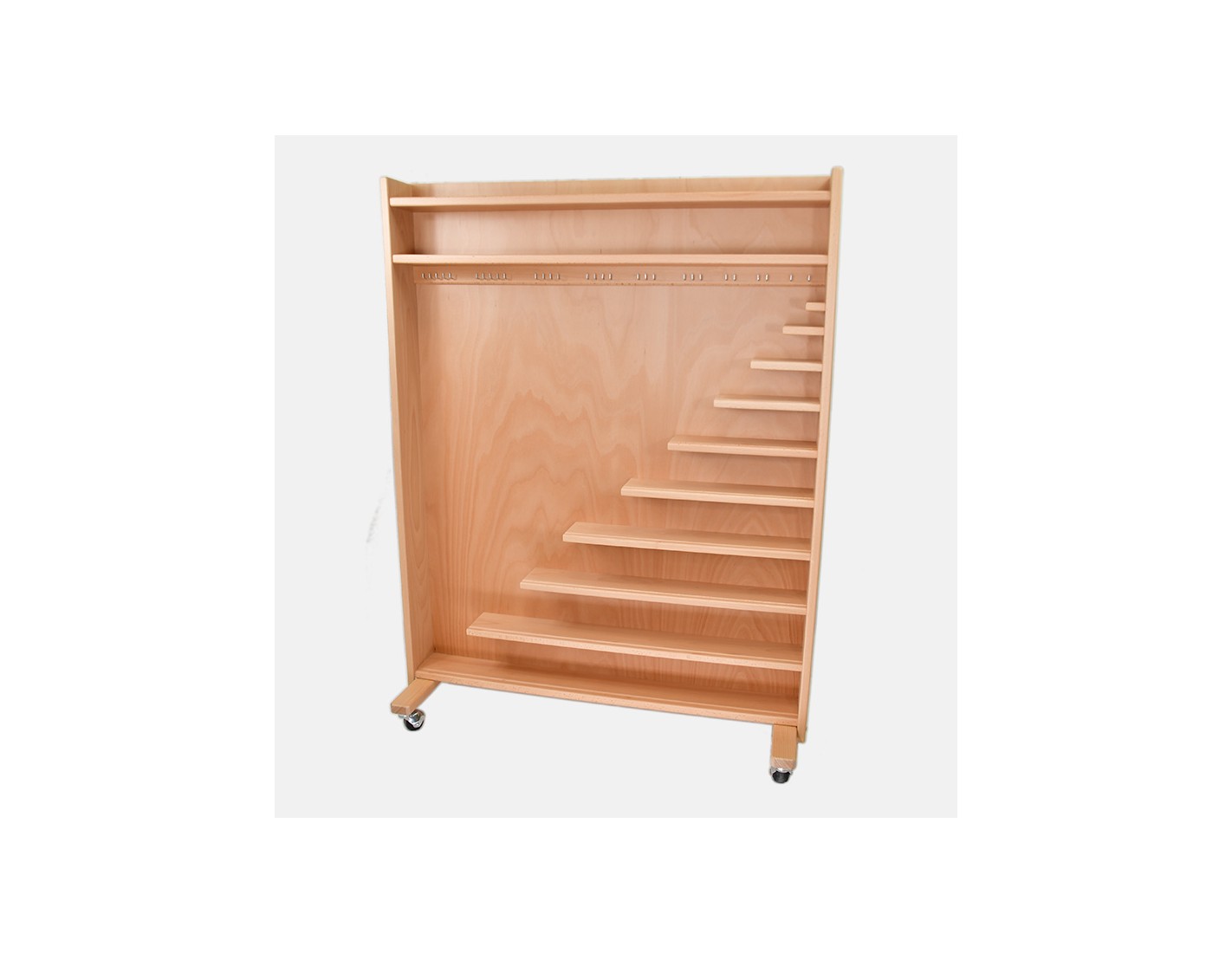 A wooden shelf with wheels, with shelves of different lengths and hooks to hang the chains.