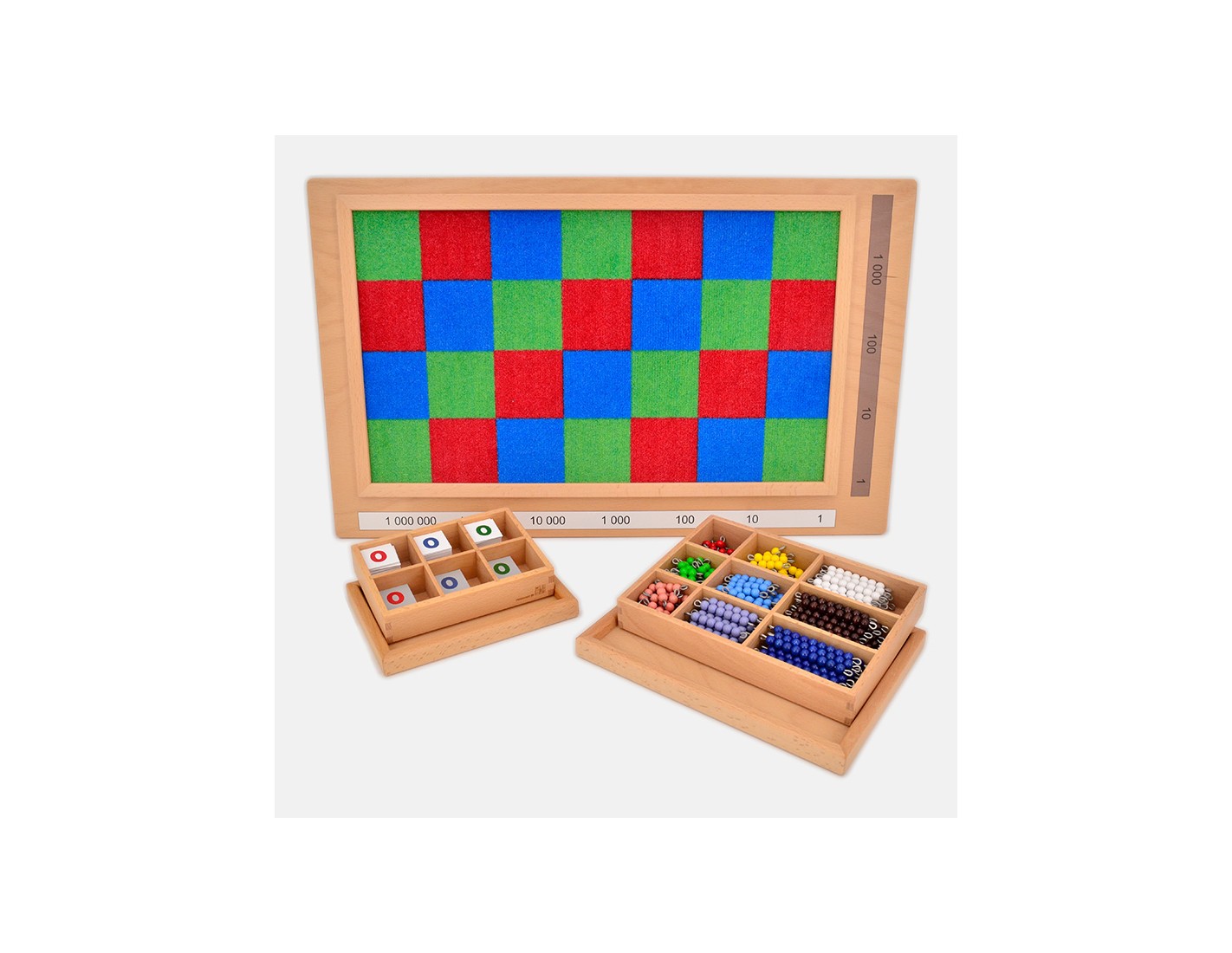 Carpet checkered board with diagonally arranged squares, in hierarchical colors, from simple units to millions; 1 compartment box with 20 sets of sticks from 1 to 9 (in stainless steel) of colored wooden beads; 1 box with 7 sets of numbers from 0 to 9 in hierarchical colors on a white background and 4 sets on a gray background.