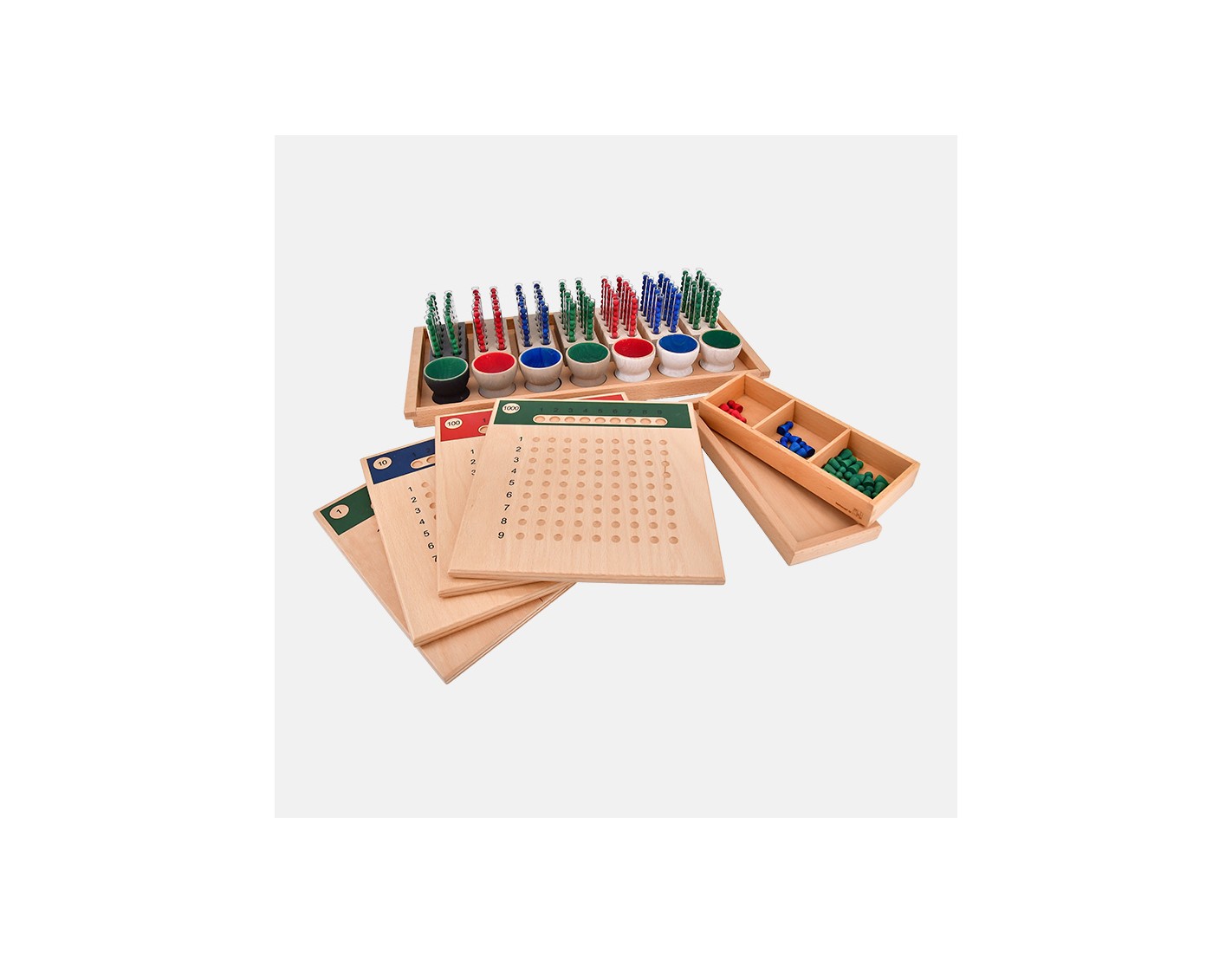 4 wooden boards with colour coding, a 47.5 x 22.5 x 2.5 cm wooden tray containing 7 test tube holders with 70 glass test tubes; 700 8 mm wooden beads; 7 wooden cups; 36 wooden skittles in a box with lid; all divided according to hierarchical colors and contained in a wooden box with lid.