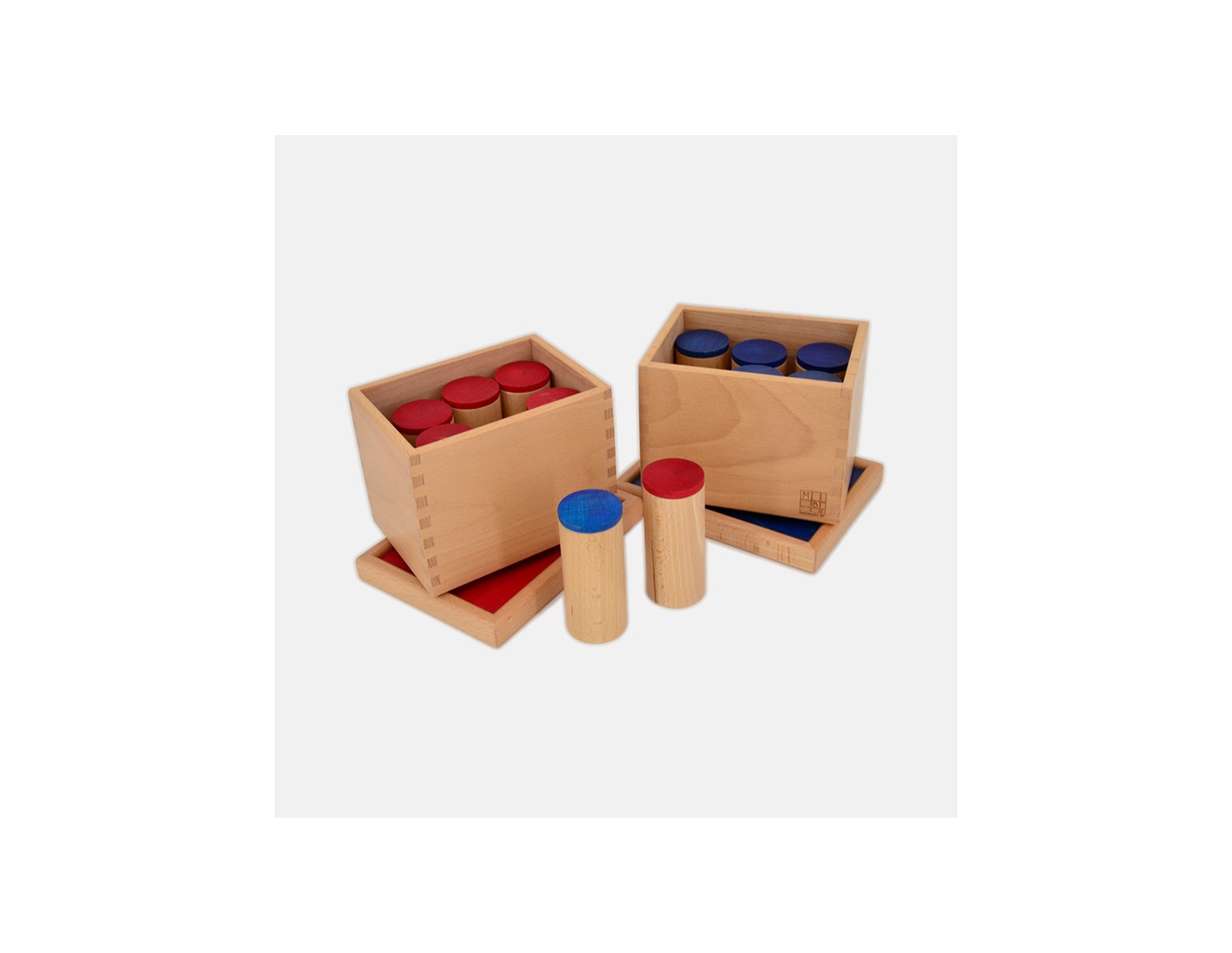 The material includes two wooden boxes with red and blue coloured lids, each containing a set of 6 cylinders with coloured lids. Each set contains different grains in gradation so that the cylinders, when shake, produce different sounds. The 2 sets. red and blue, have the same content so that they can be matched. Boxes and cylinders are Made in Italy and of high artisanal quality, with UNI EN 71-3 finishing.