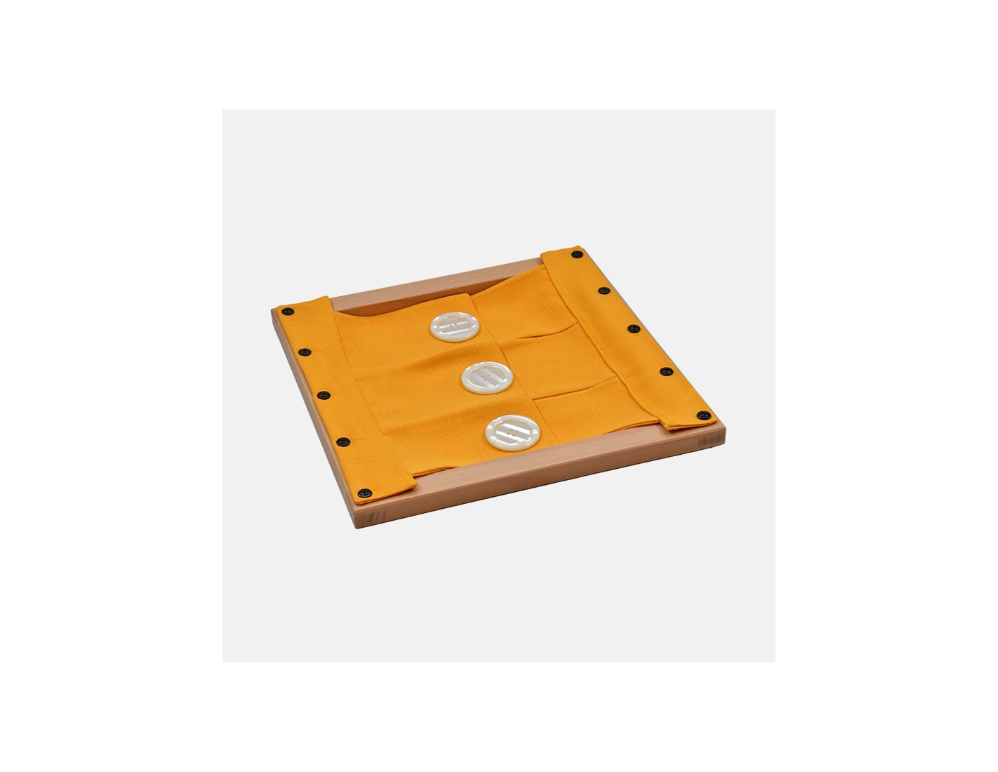 Un telaio in legno di faggio 30 x 30 cm, al quale sono fissati due lembi di stoffa di cotone uniti con 3 asole e bottoni grandi.