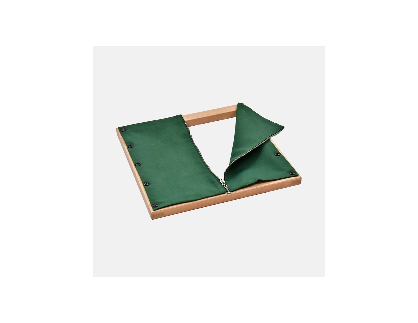 Un telaio in legno di faggio 30 x 30 cm, al quale sono fissati due lembi di stoffa di cotone uniti con una cerniera in metallo.