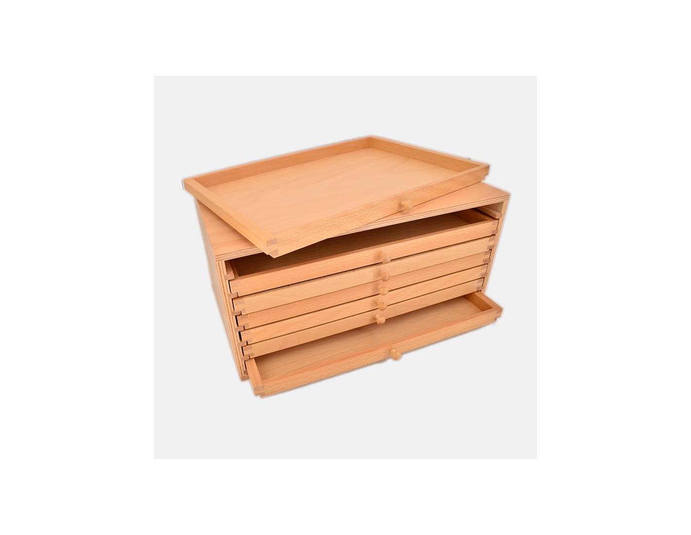 Cofanetto della botanica con 7 vassoi vuoti, muniti di pomolo di presa, realizzato in legno di faggio e verniciato con prodotti atossici. Dimensioni esterne: 48,5 x 30 x 23,5h cm.
