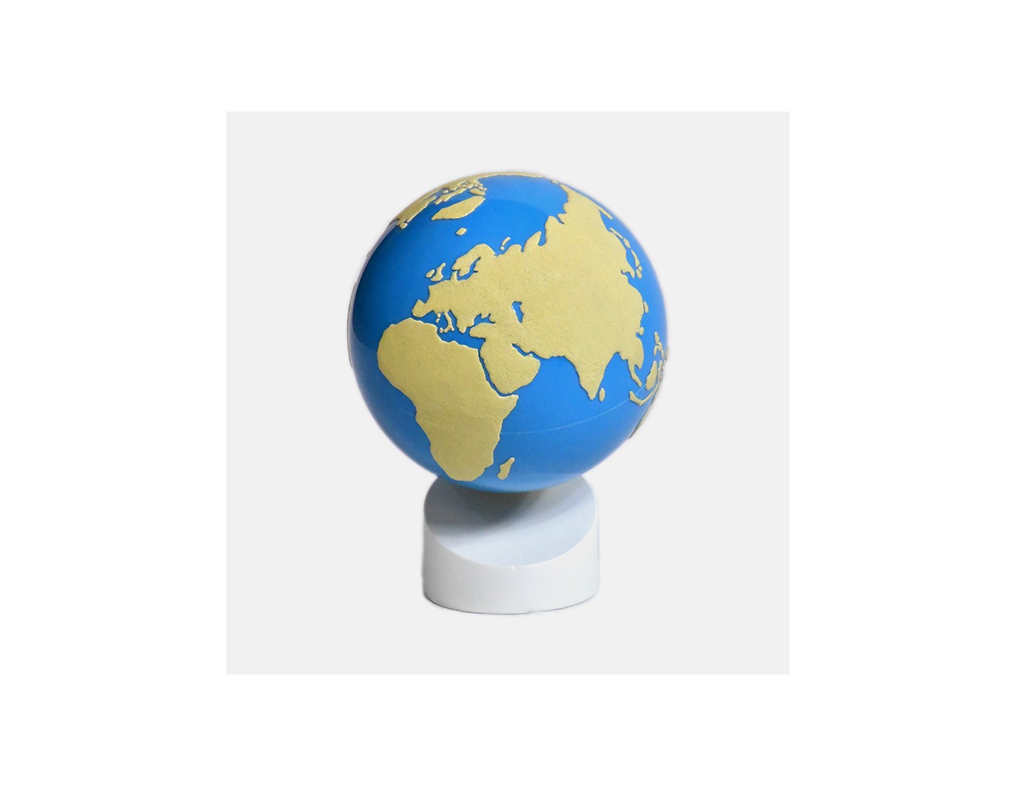 Globo in plastica su base in legno. Le terre emerse sono rappresentate da una superfice smerigliata, mentre gli oceani da un azzurro liscio così da garantire un’esperienza sensoriale della terra e dell’acqua. Il globo è inclinato a 23° come l’asse terrestre.