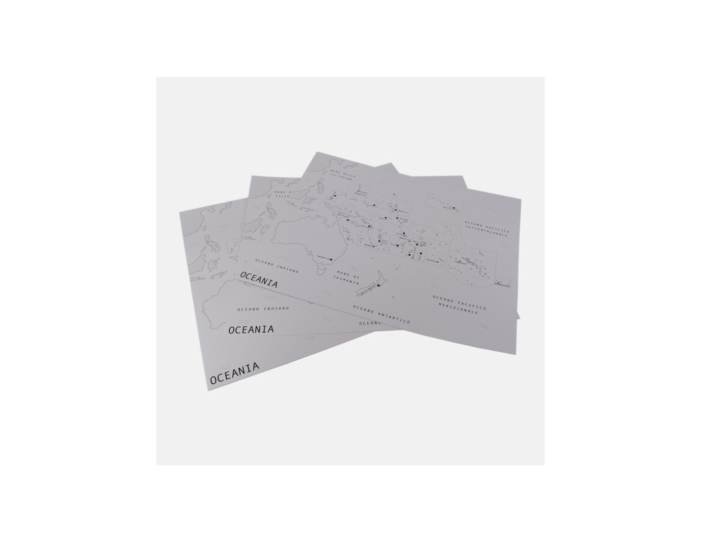 Tre cartine in cartoncino patinato: muta, nomi degli Stati, nomi delle capitali. Dimensioni: 47 x 37,5 cm.