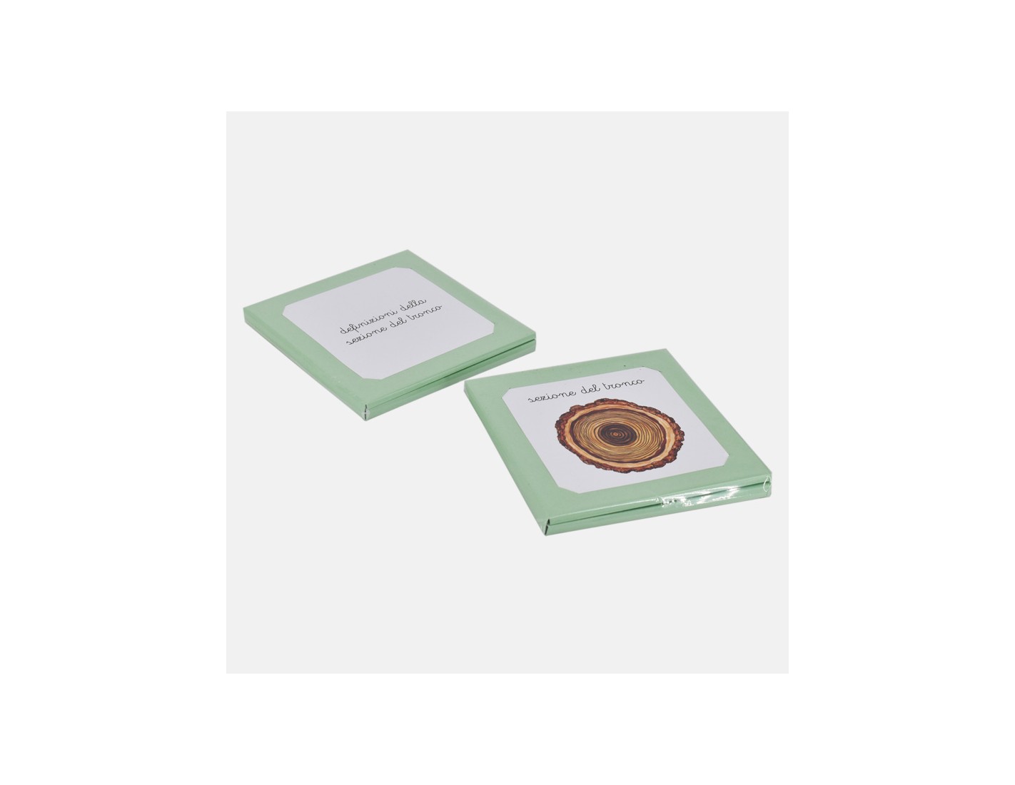 Nomenclature montessoriane della sezione di un tronco d'albero e delle sue specifiche definizioni. Illustrazioni fedeli approvate da esperti, realizzate a mano e riprodotte. Disponibile in italiano.