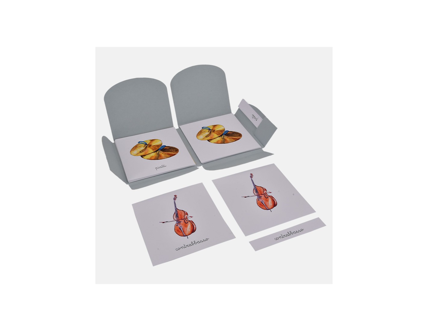 Nomenclature montessoriane degli strumenti musicali. Illustrazioni fedeli approvate da esperti, realizzate a mano e riprodotte. Lingua: inglese.