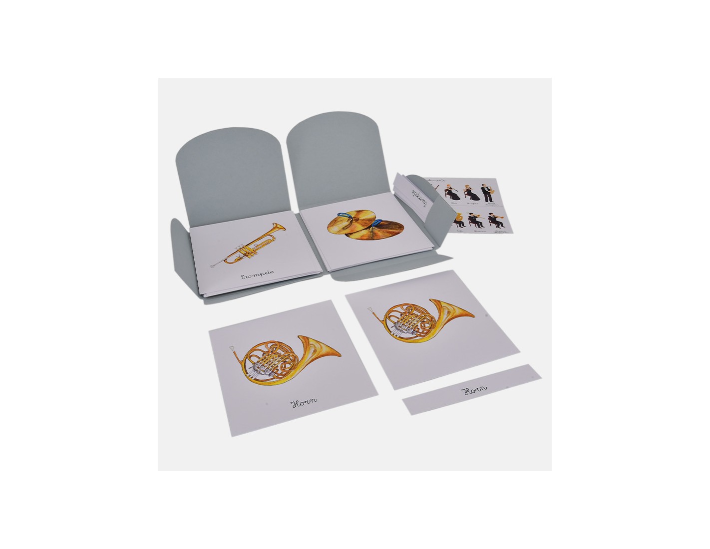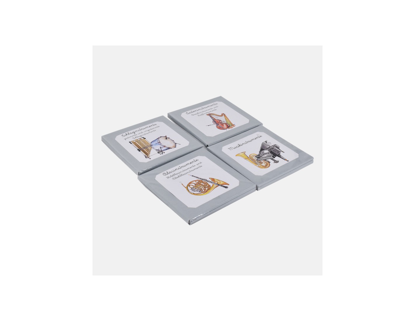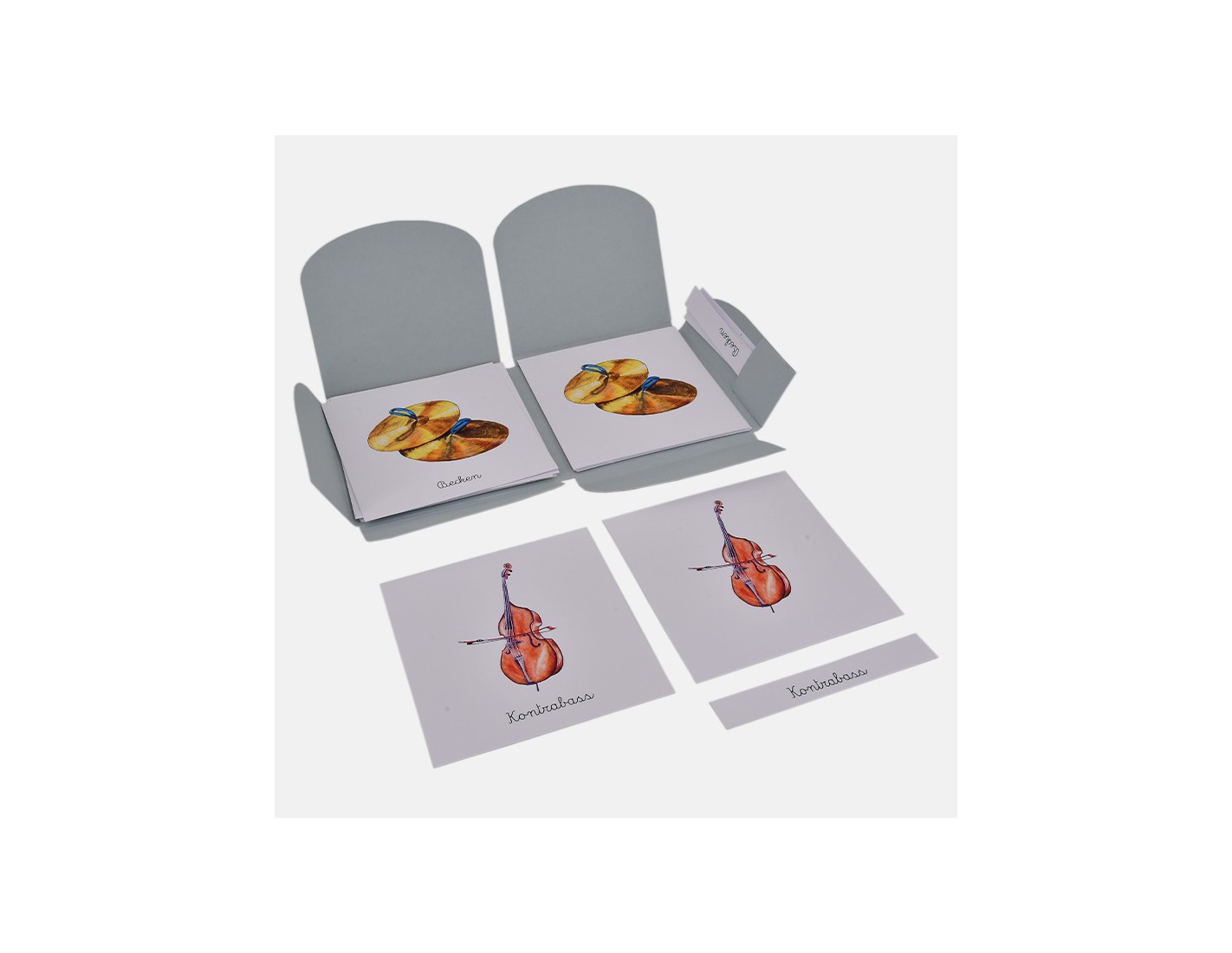Nomenclature montessoriane degli strumenti musicali. Illustrazioni fedeli approvate da esperti, realizzate a mano e riprodotte. Lingua: tedesco.