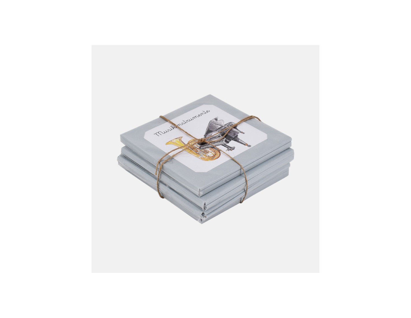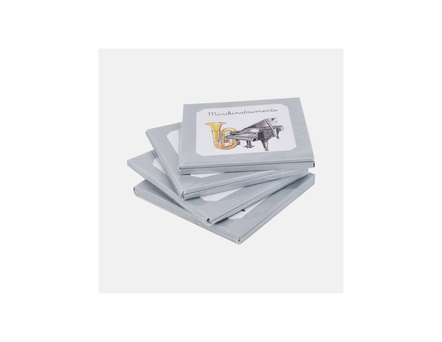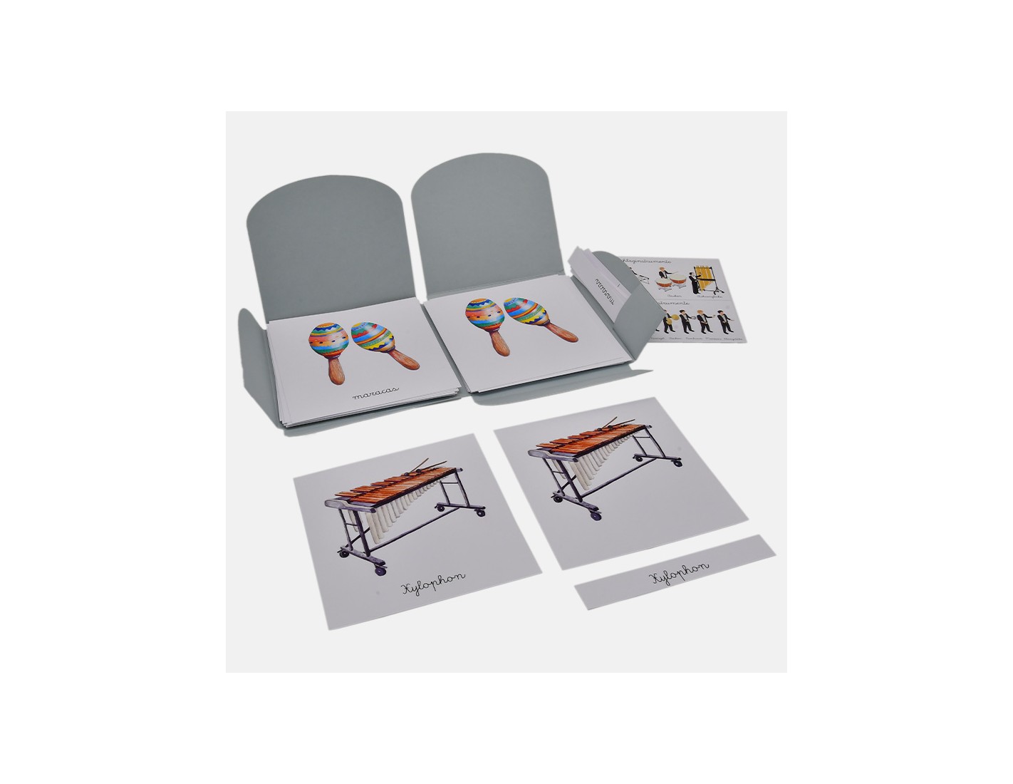 Nomenclature montessoriane degli strumenti musicali. Illustrazioni fedeli approvate da esperti, realizzate a mano e riprodotte. Lingua: tedesco.