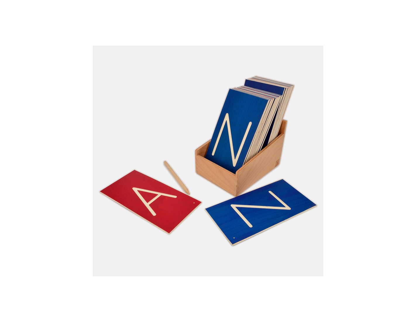 Casellario con alfabeto stampato maiuscolo, inciso. Le vocali sono incise su una tavoletta con sfondo rosso, le consonanti su sfondo blu. La confezione contiene un bastoncino per introdurre il movimento della scrittura. Con questo materiale il bambino può seguire con il dito o con il bastoncino la direzione di scrittura grazie ad una guida tattile. Dimensioni esterne tavolette: 13x26 cm.