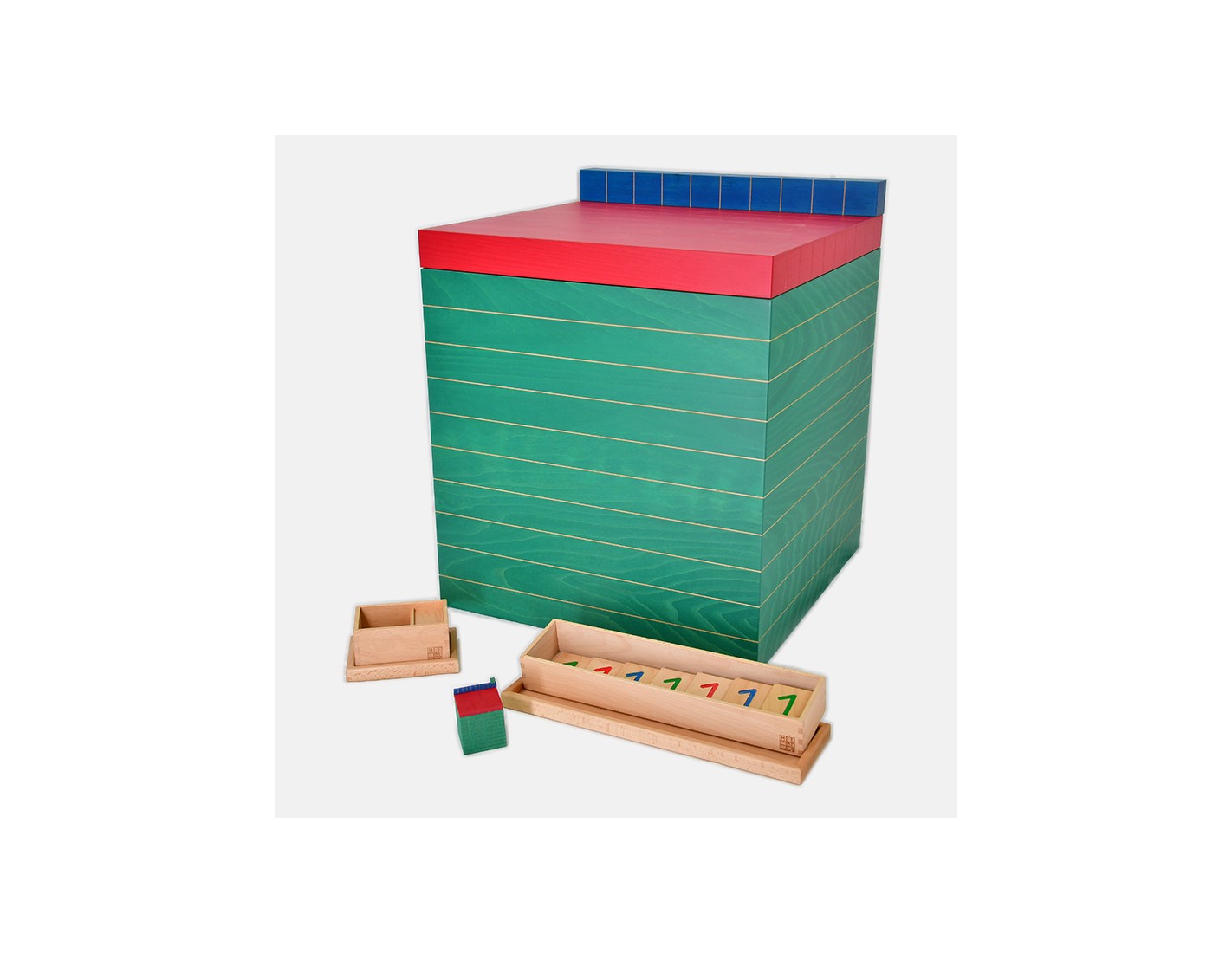 3 cubi e 4 prismi di legno, di dimensioni e colori appropriati, per rappresentare unità, decine e centinaia delle diverse famiglie di numeri (le linee sui cubi e sui prismi più grandi sono incise). Un set di schede di legno incise con i numeri 1, 10, 100, 1000, 10000, 100000, 1000000, 1000000 per l'abbinamento e la quantità, contenute in una scatola.