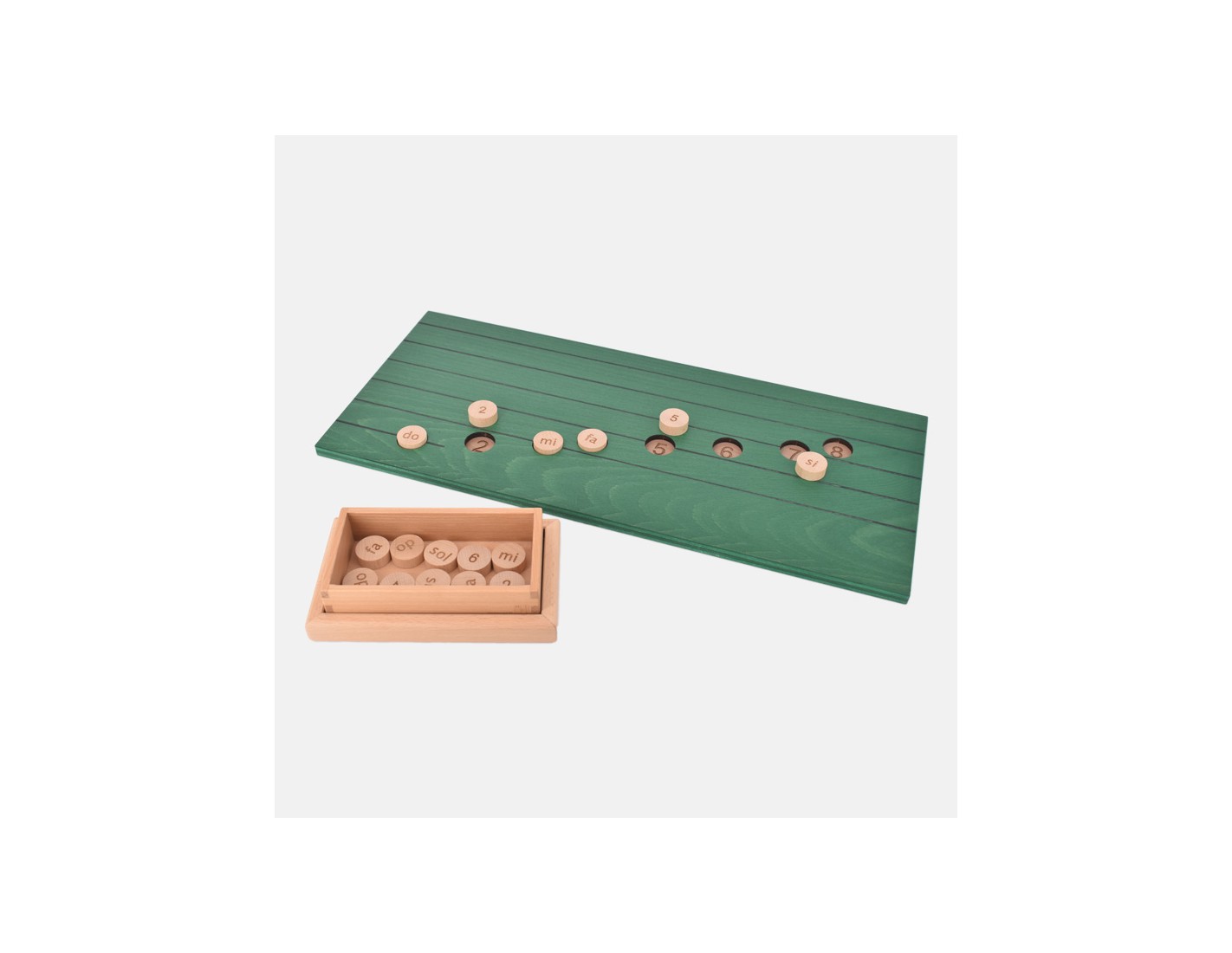 Tavola in legno con il pentagramma inciso, con incavi circolari contrassegnati con i numeri 1-8 corrispondenti alla scala di Do maggiore. Una scatola in legno a due scomparti contenente 2 serie di 8 dischetti con incisi il nome delle note su un lato e i numeri 1-8 sull’altro.