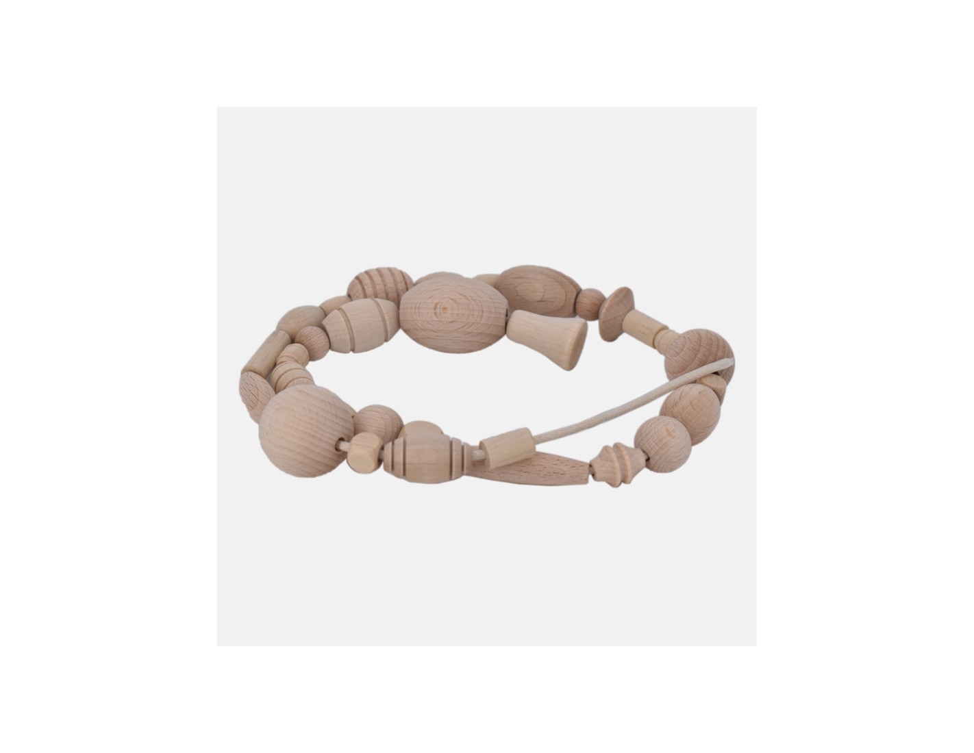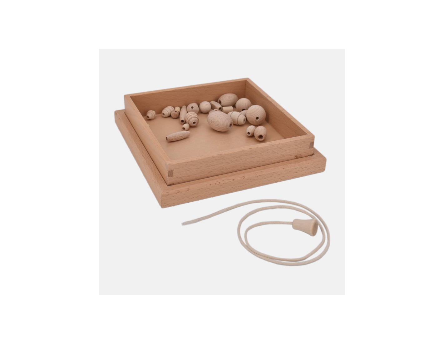 Set per attività dell'infilare: una cordicella con bastoncino in legno e punta arrotondata, 30 perle forate in legno, di forme e dimensioni differenti; il tutto contenuto in una scatola in legno di faggio con coperchio, di dimensioni 15 x 15 cm.