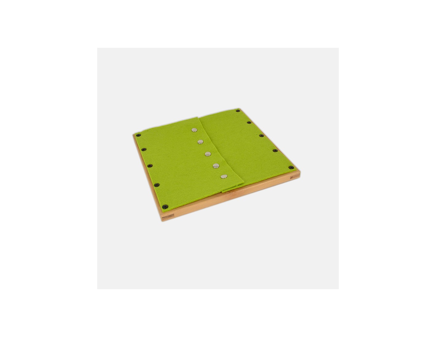 Un telaio in legno 30 x 30 cm, al quale sono fissati due lembi di feltro uniti con 5 bottoni a pressione.