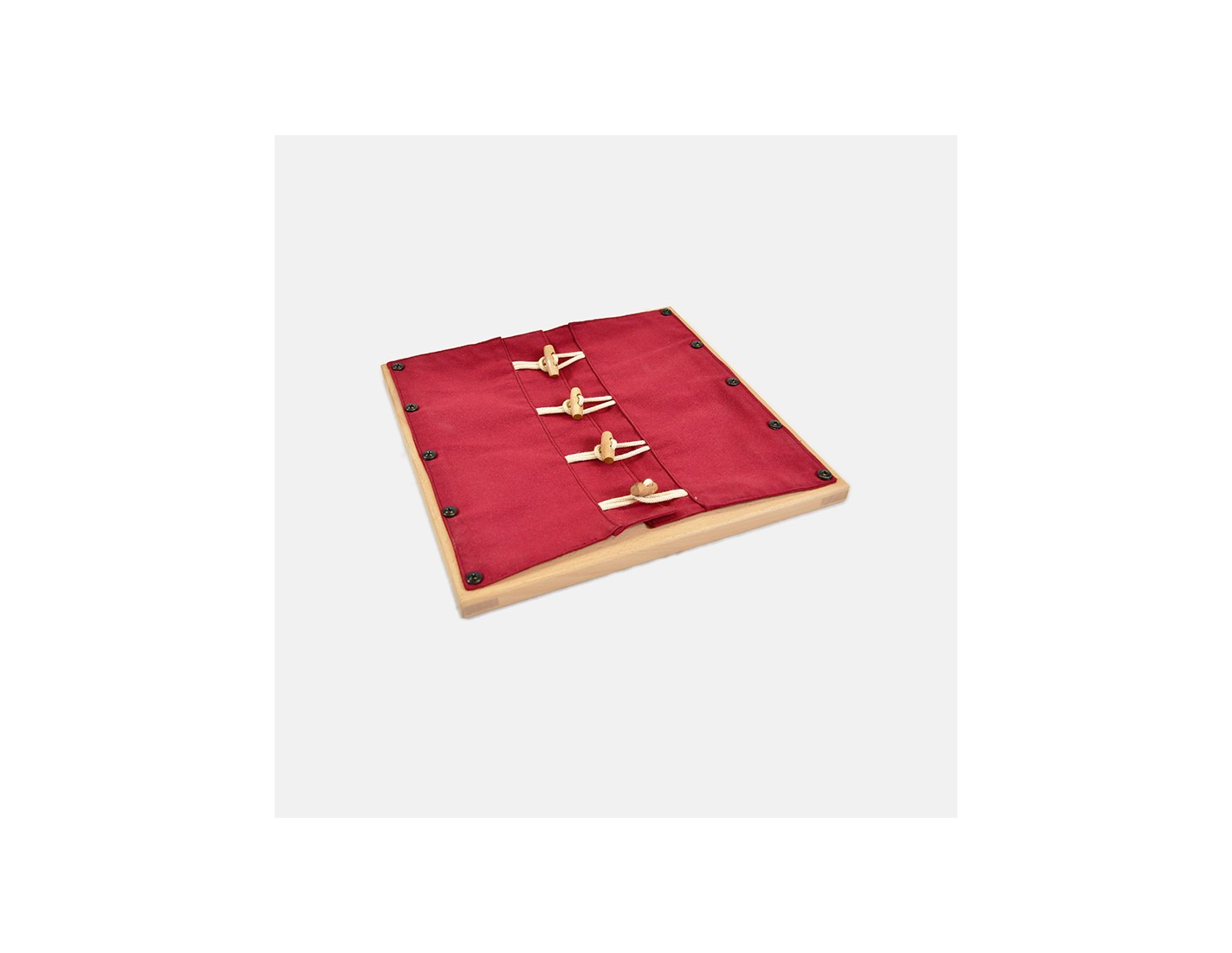 Un telaio in legno 30 x 30 cm, al quale sono fissati due lembi tela di cotone uniti con 5 alamari.