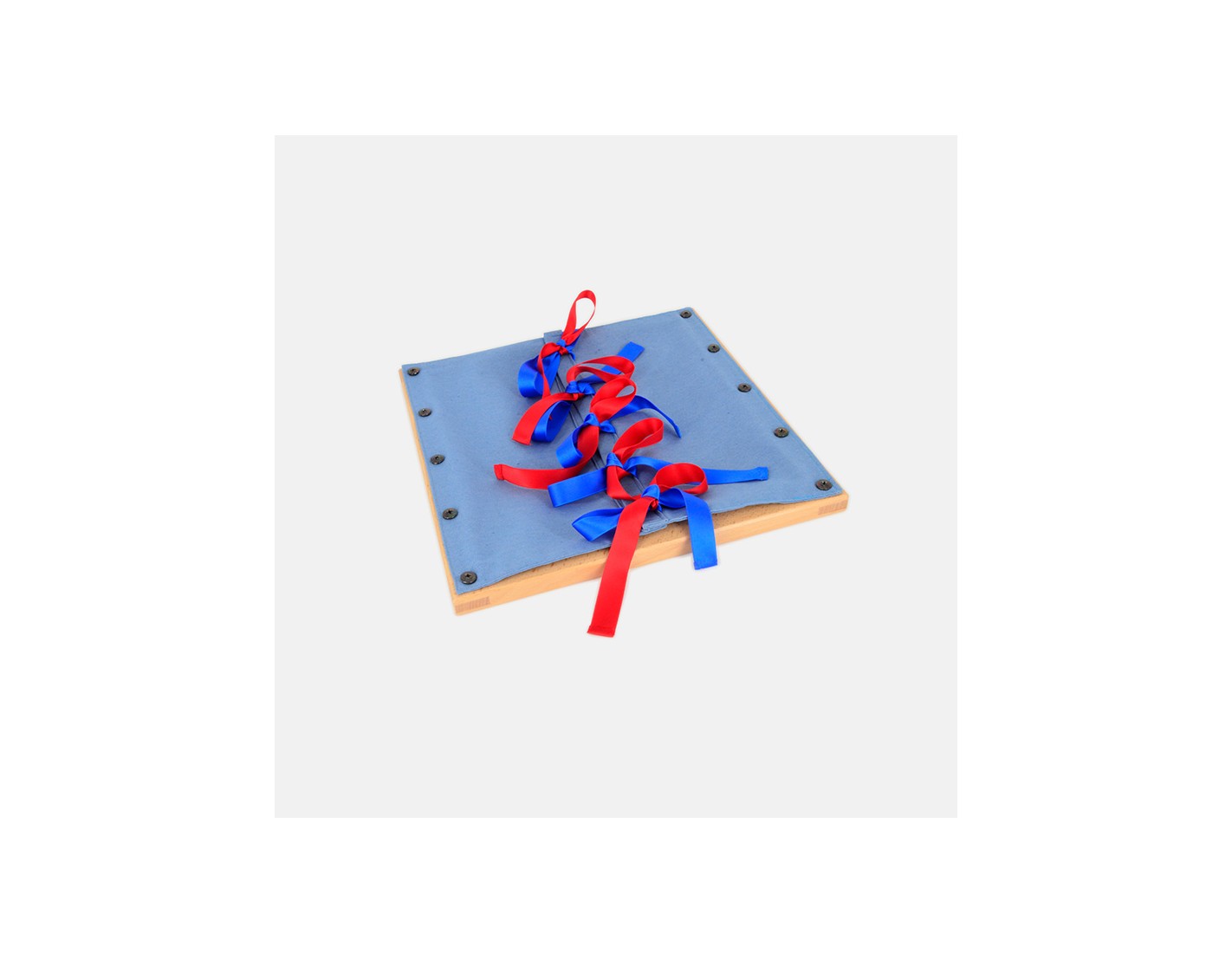 Un telaio in legno 30 x 30 cm, al quale sono fissati due lembi di stoffa di cotone uniti con nastrini in raso di due colori differenti, rosso e blu.